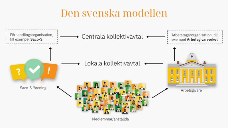 Det finns i princip två sätt att reglera arbetsmarknaden: genom lagstiftning eller kollektivavtal. I Sverige har vi arbetsrättslig lagstiftning som en grund som fylls ut med fler och bättre villkor genom kollektivavtal. Det innebär att fackförbunden och arbetsgivarna tar ansvar för att genom kollektivavtal komma överens om vad som ska gälla inom respektive bransch och på arbetsplatsen.
